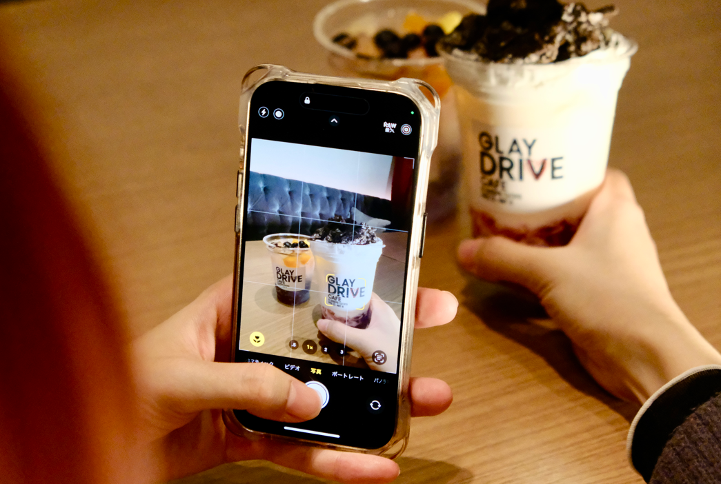 ① カフェのドリンクや、お好きなドリンクで乾杯写真や動画を撮影
